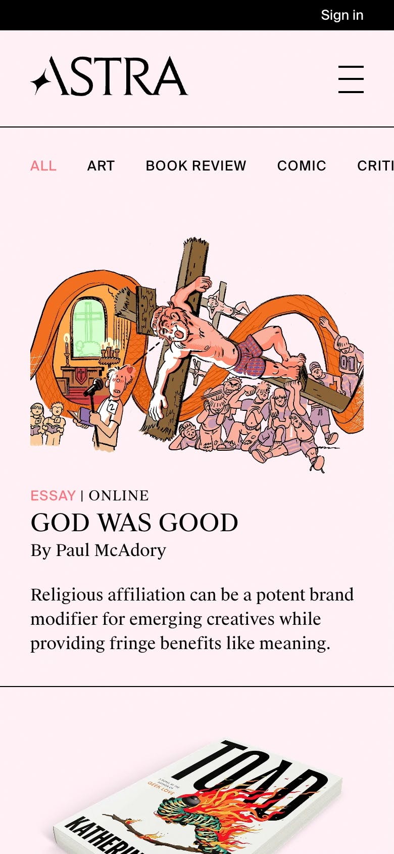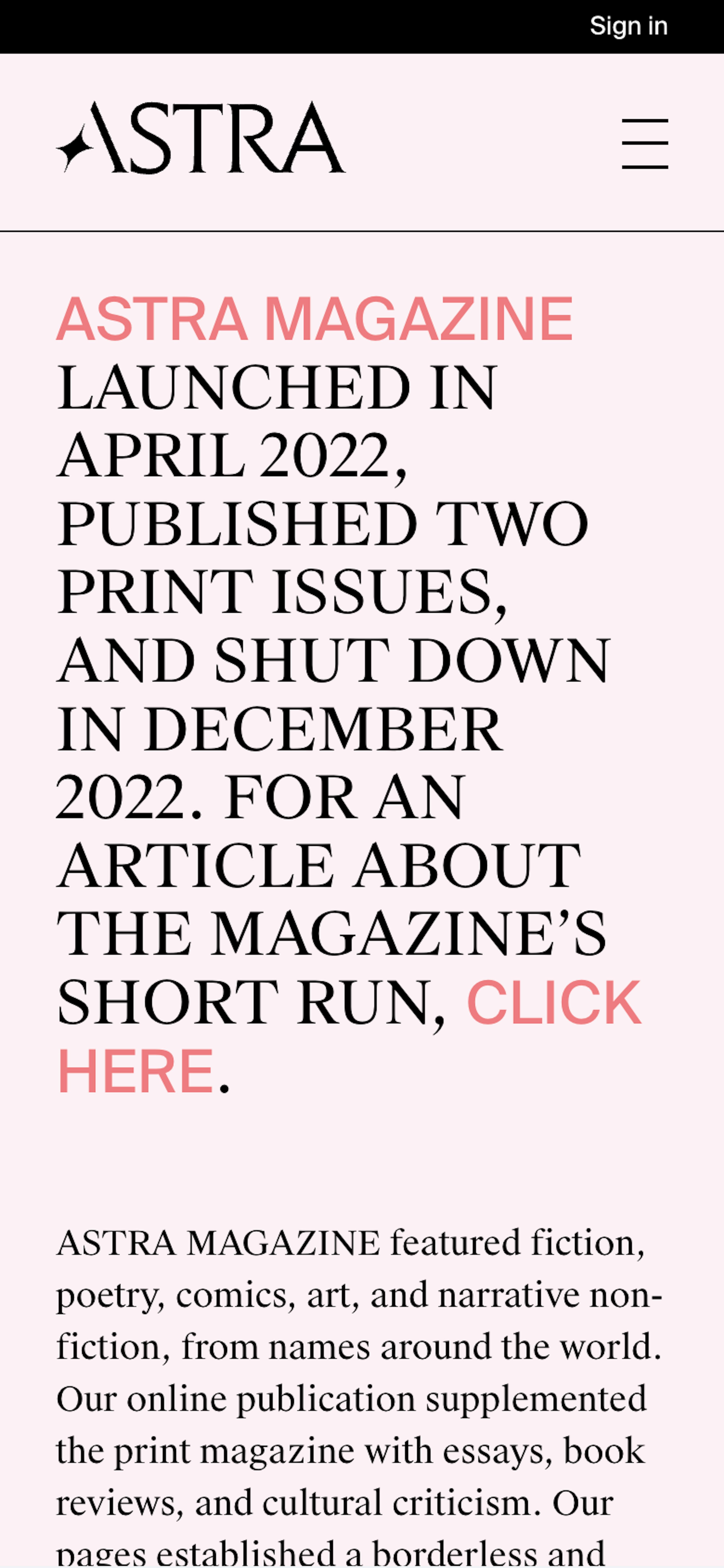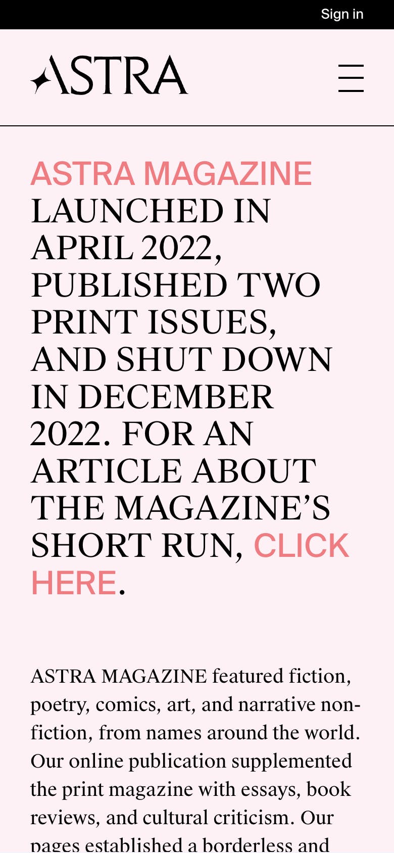 We partnered with Astra and Shannon Jager, the magazine’s creative director, to bring their vision for a website to life. Designed to supplement the print publication, Astra’s site is home to essays, book reviews, and cultural criticism.