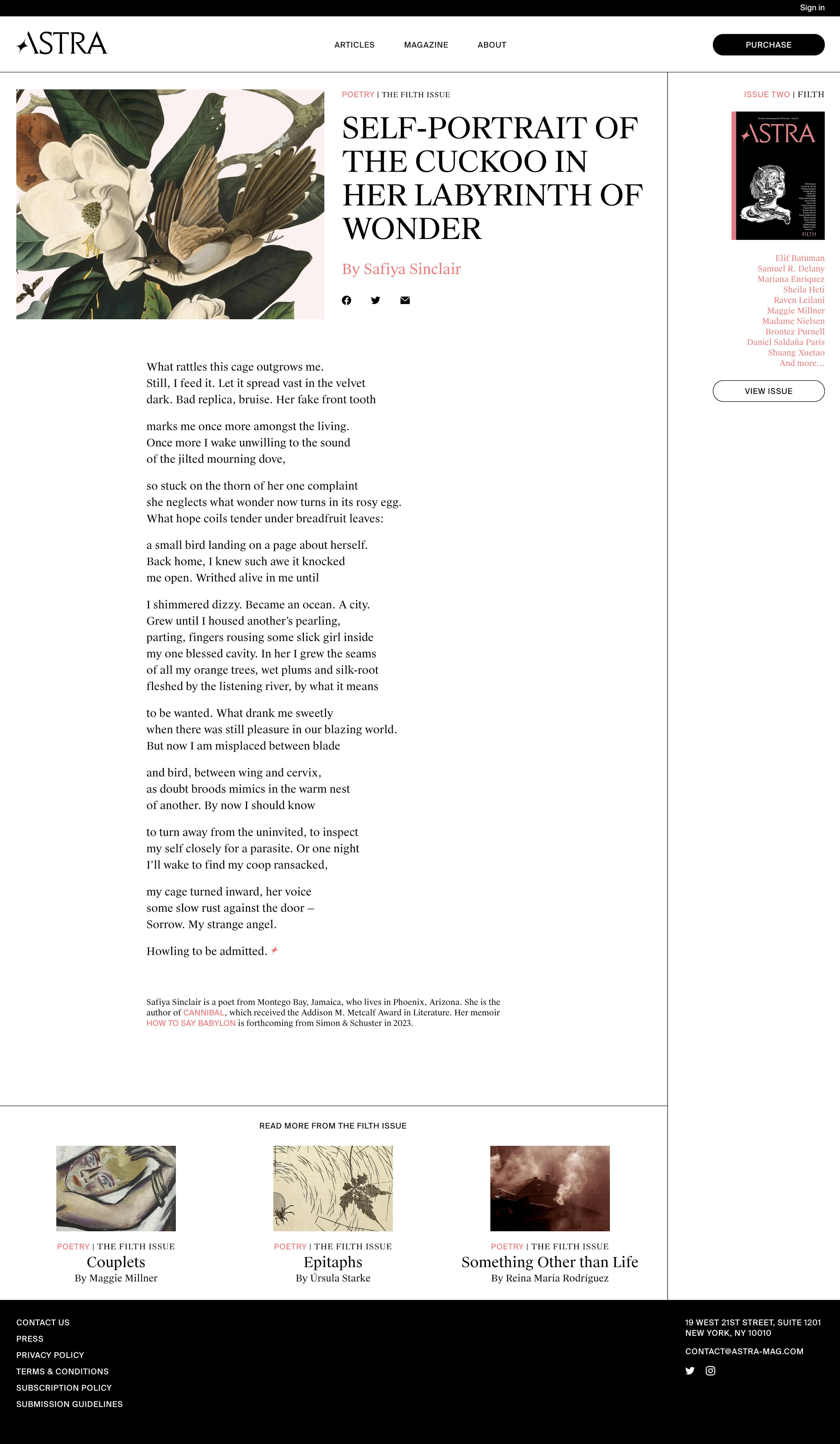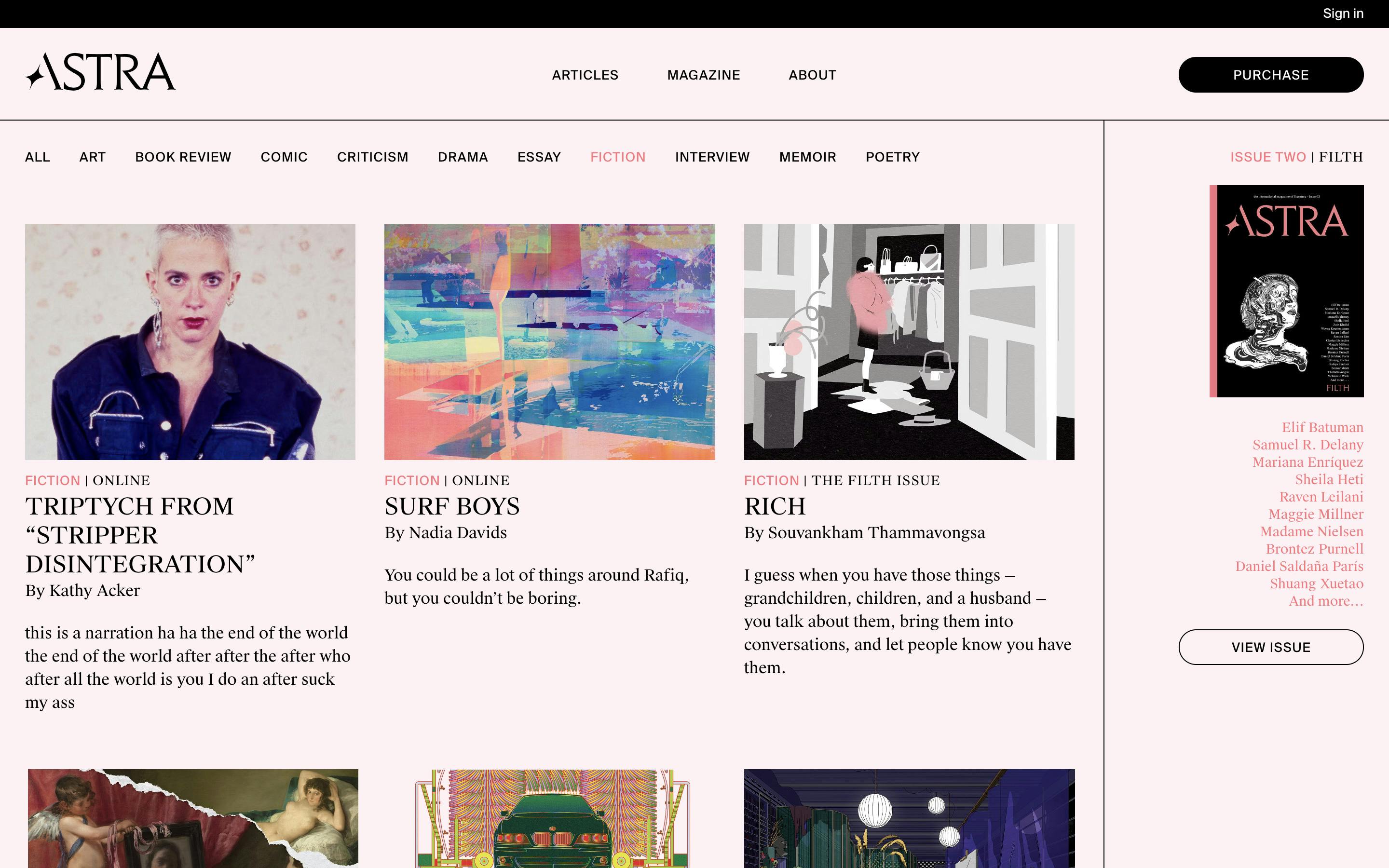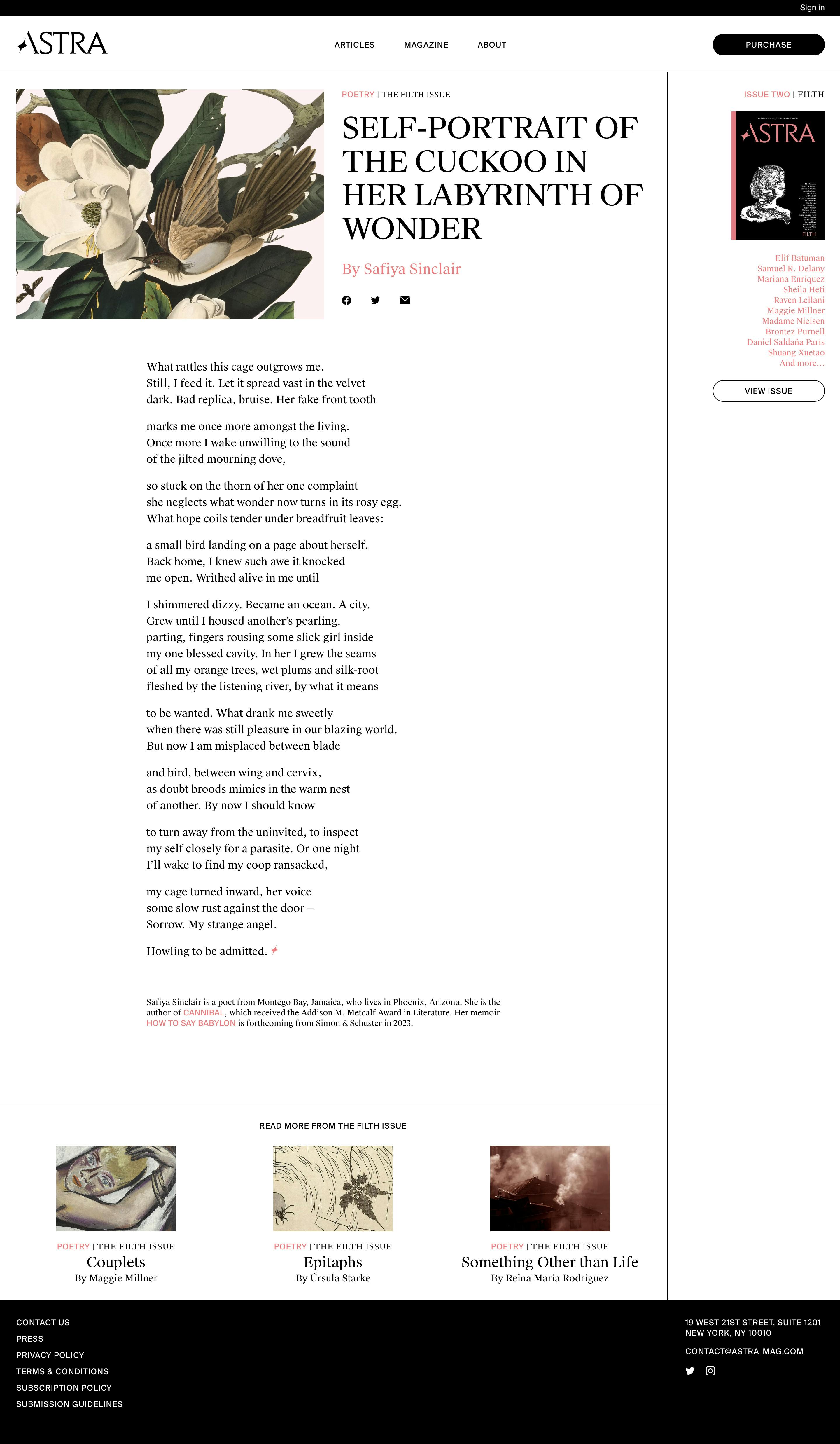 With an interest in the inter: the overlaps, the in-between, and authors who defy easy categorization, Astra Magazine features fiction, poetry, comics, art, and narrative non-fiction from around the world. Their pages establish a borderless approach to reading, with a focus on literature in translation and original writing in English.