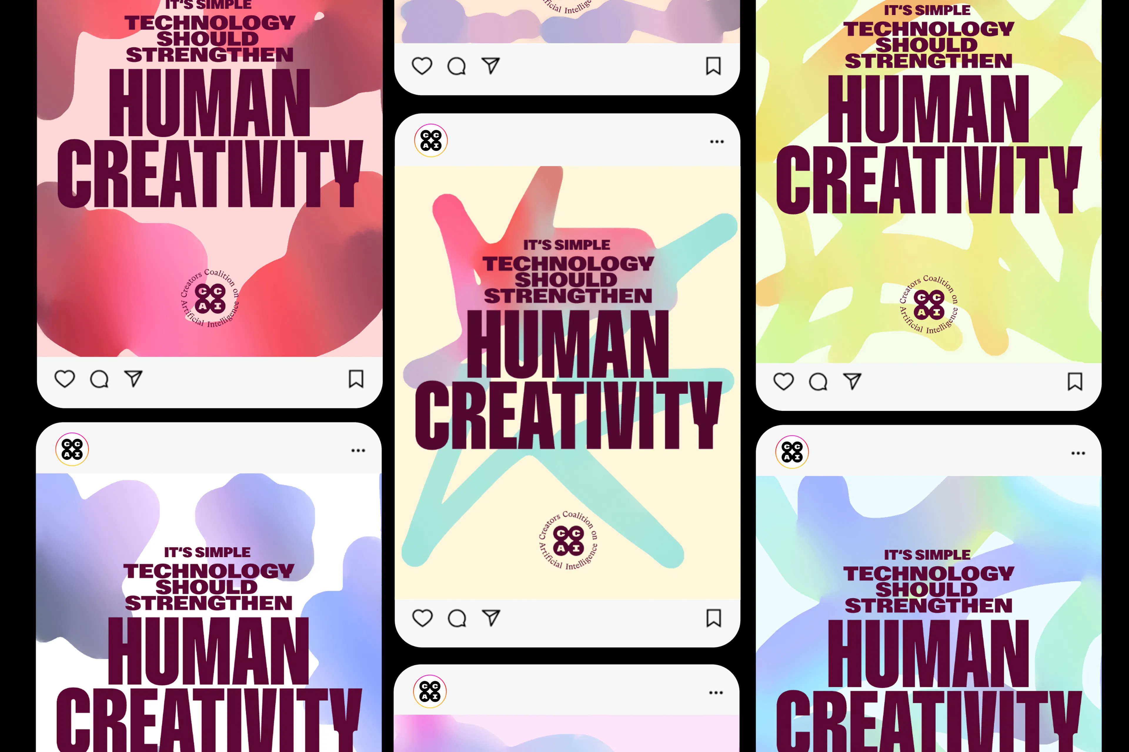 Backed by more than 500 actors, artists, and entertainment executives, CCAI believes that “technology should strengthen human creativity, not undermine it.” It was critical that the new brand feel human-made and human-led—almost like a grassroots campaign. Our logomark features four converging circles to represent the unified coalition, with a central “spark” emerging from their intersection. The logo reminds the world that technology serves us, not the other way around, and that the act of creation is always the result of collaboration between real humans.