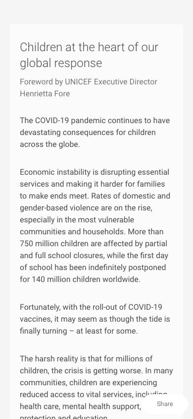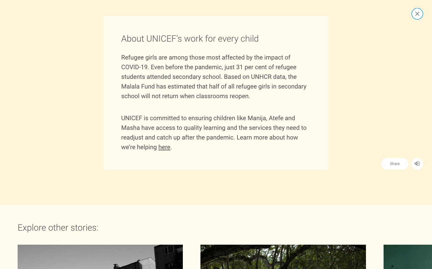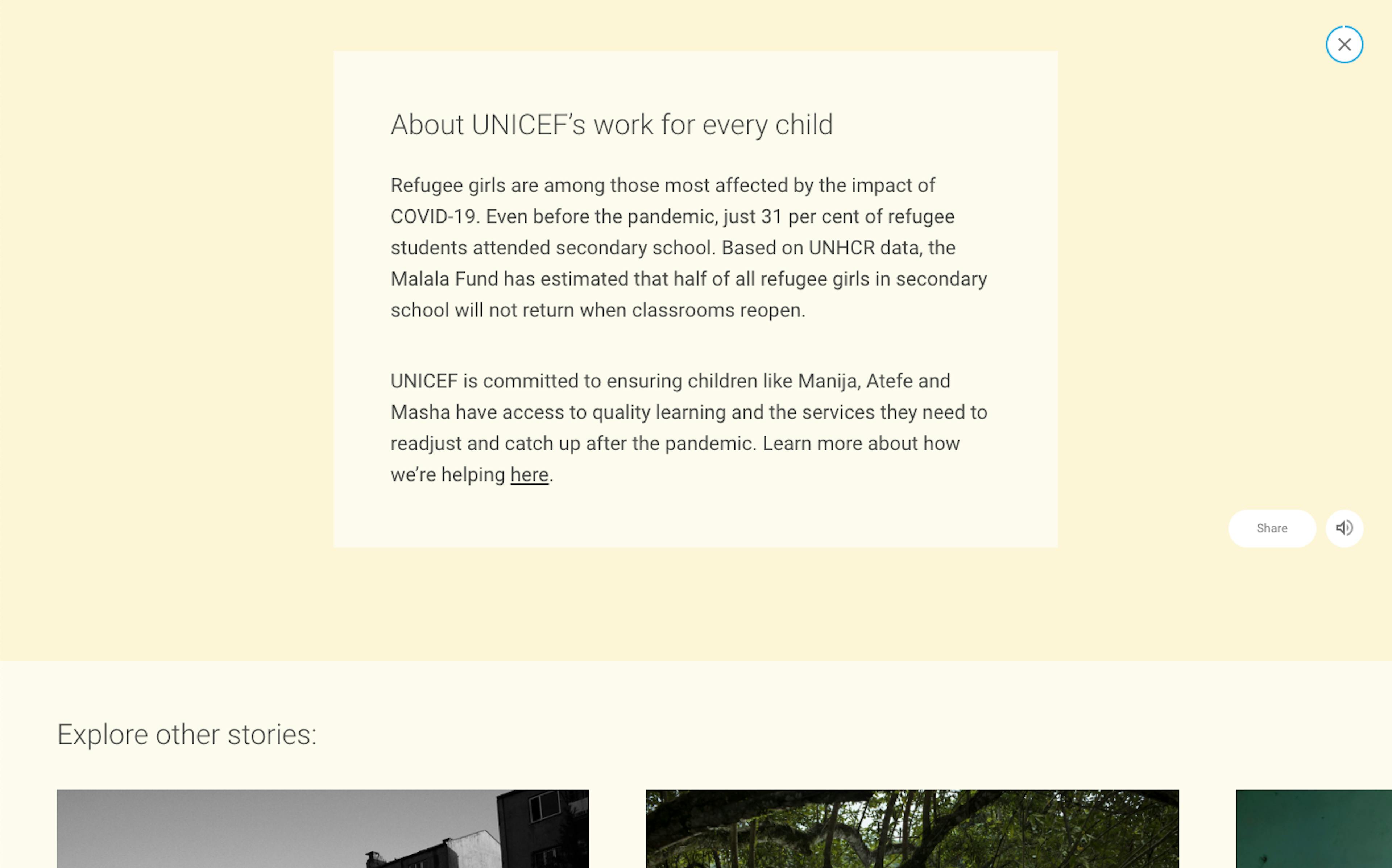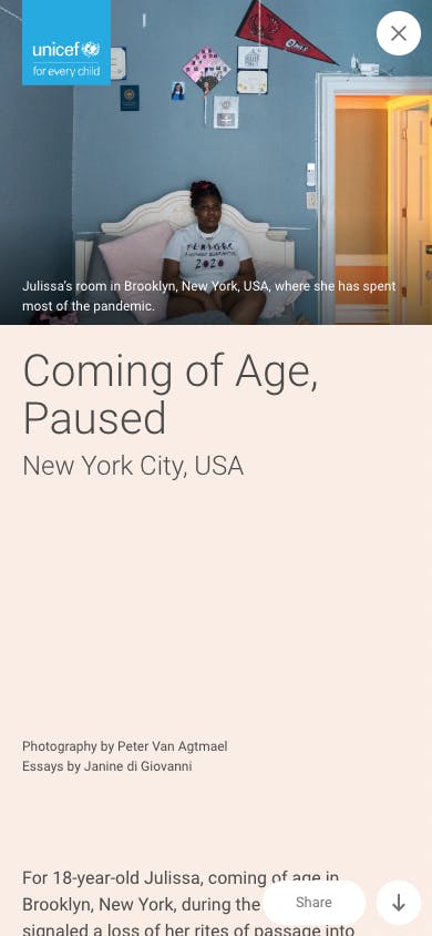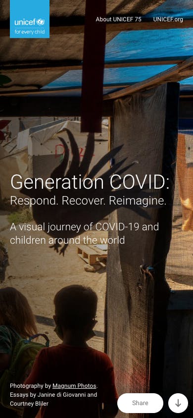 As UNICEF commemorated this milestone anniversary, it was critical that Generation COVID provide a clear and actionable way for users to help. Anchored CTAs throughout each story gently encourage viewers to get involved and share the work without distracting from the content. Additionally, at the end of each story, we designed pathways to encourage users to explore other stories.