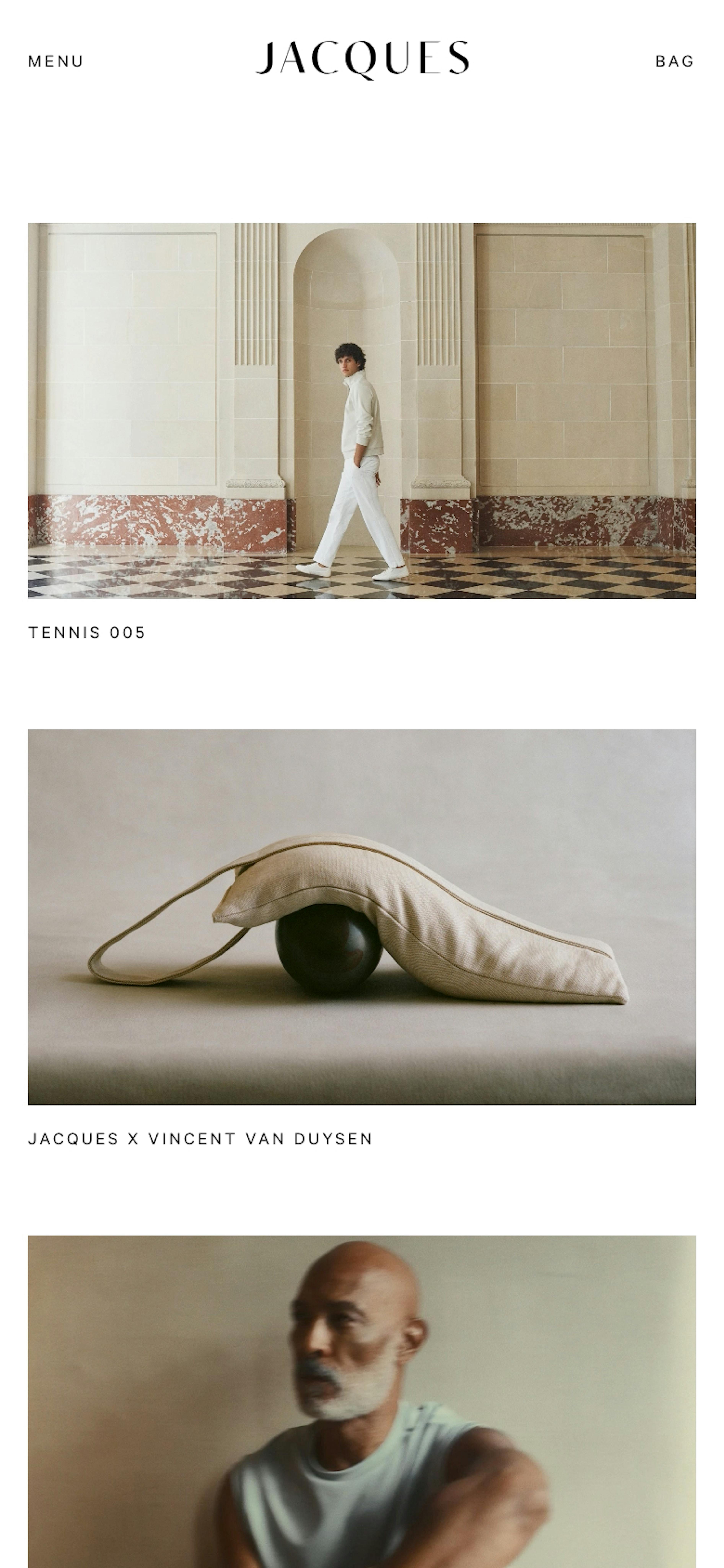 The minimalist design of the site serves as the perfect backdrop for JACQUES’ impeccably crafted products, directing the user’s attention to the essence of each piece: its quality, construction, and fine details. In this uncluttered visual environment, every stitch, texture, and contour becomes a focal point, inviting the user to engage more deeply with the product's intrinsic beauty and exceptional workmanship.