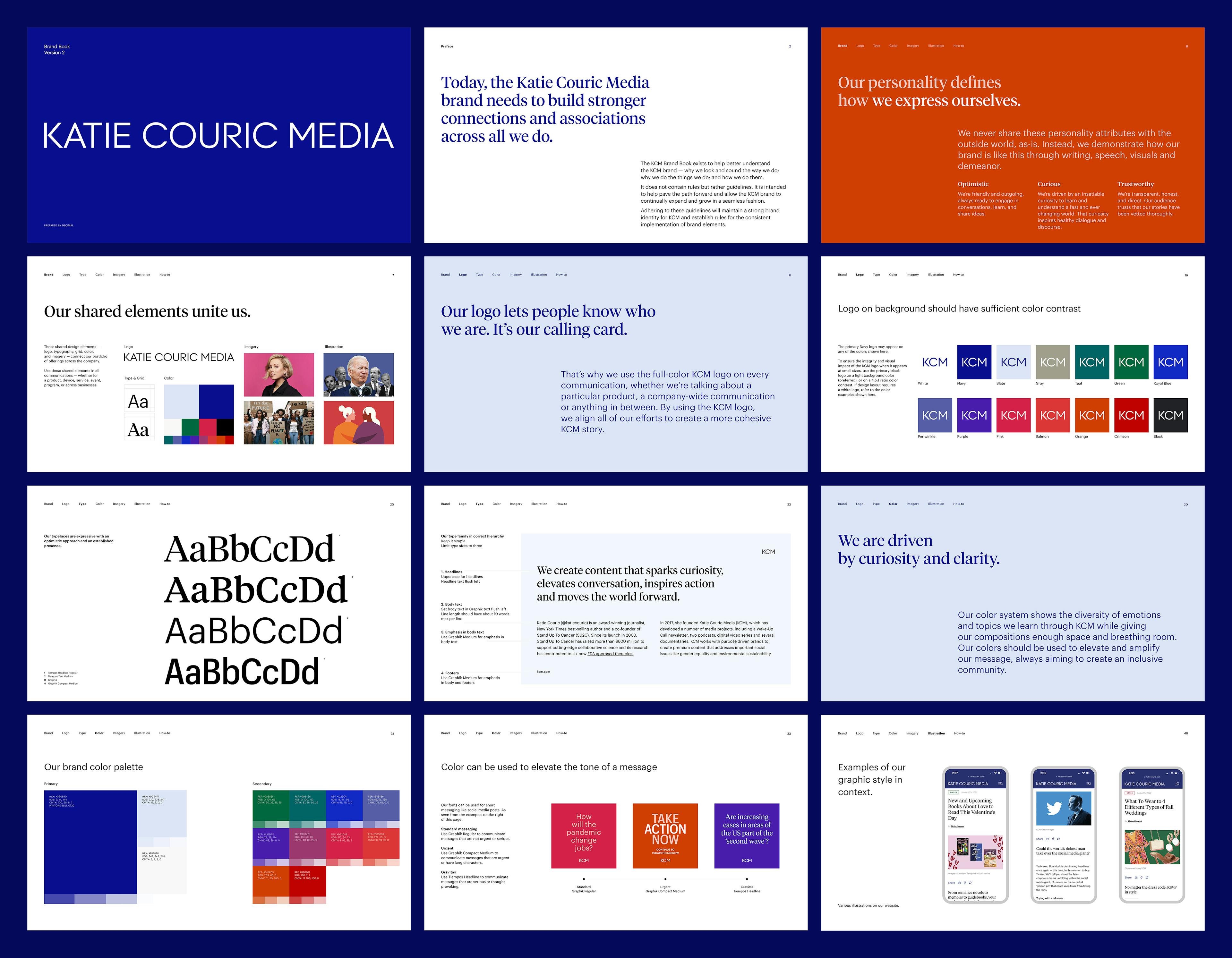 KCM content is created to spark curiosity, elevate conversations, inspire action, and move the world forward. After a comprehensive brand audit and strategic exercises that helped define KCM, we began to craft the brand’s visual identity elements — logo, typography, grid, color usage, photography, and illustration style — to communicate the KCM personality.