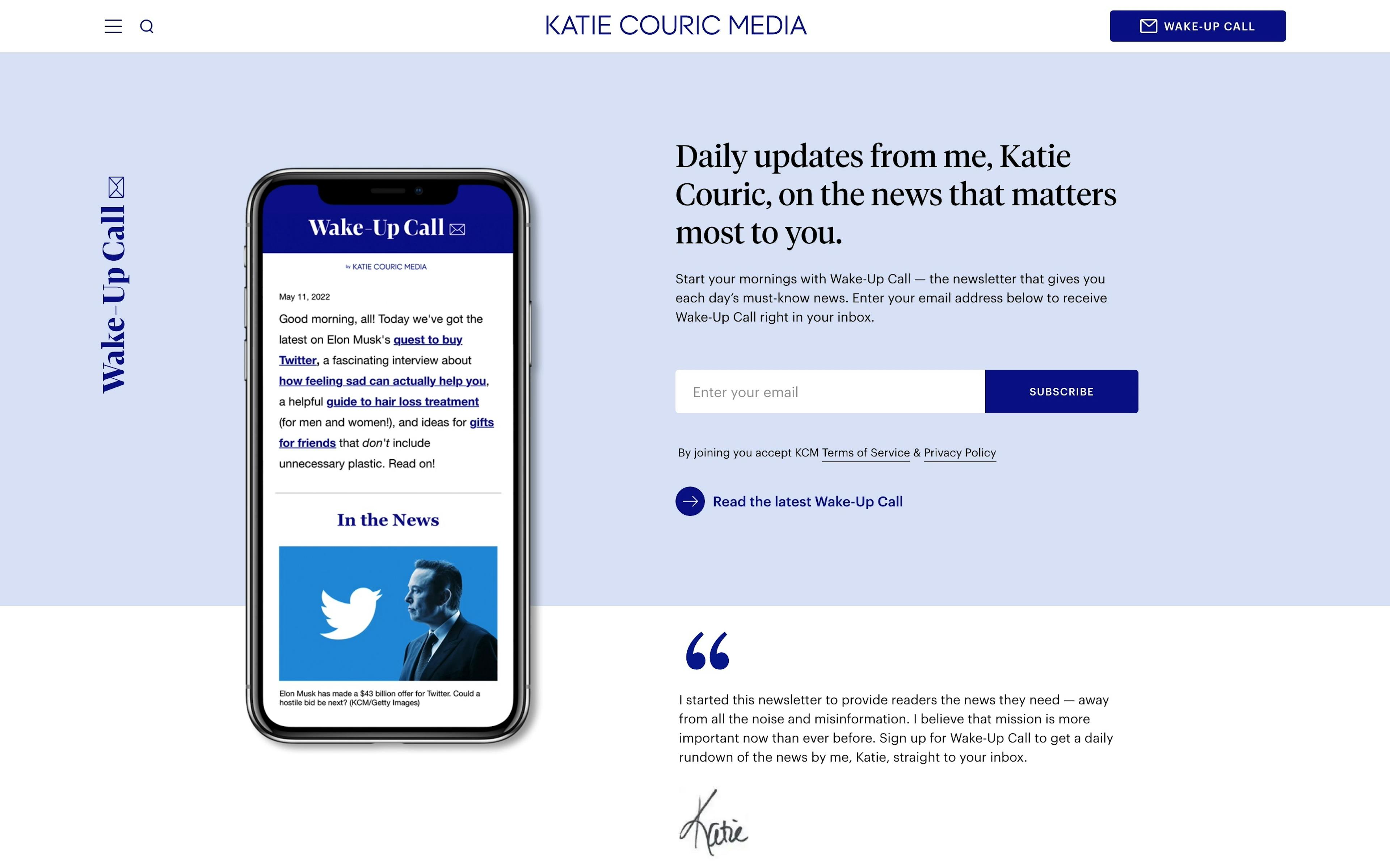 With 1M+ subscribers, KCM’s daily newsletter, “Wake-up Call,” gives readers updates on the news that matters most to them directly from Katie Couric.