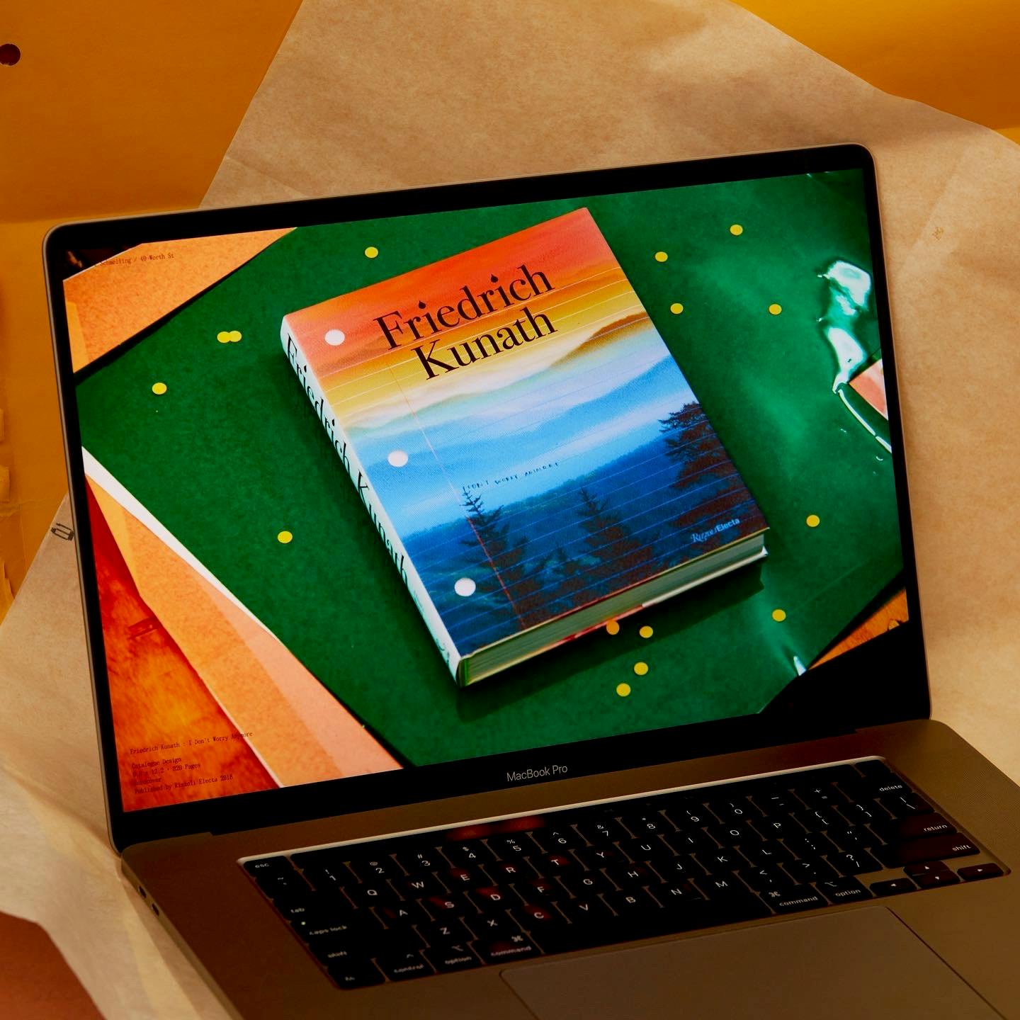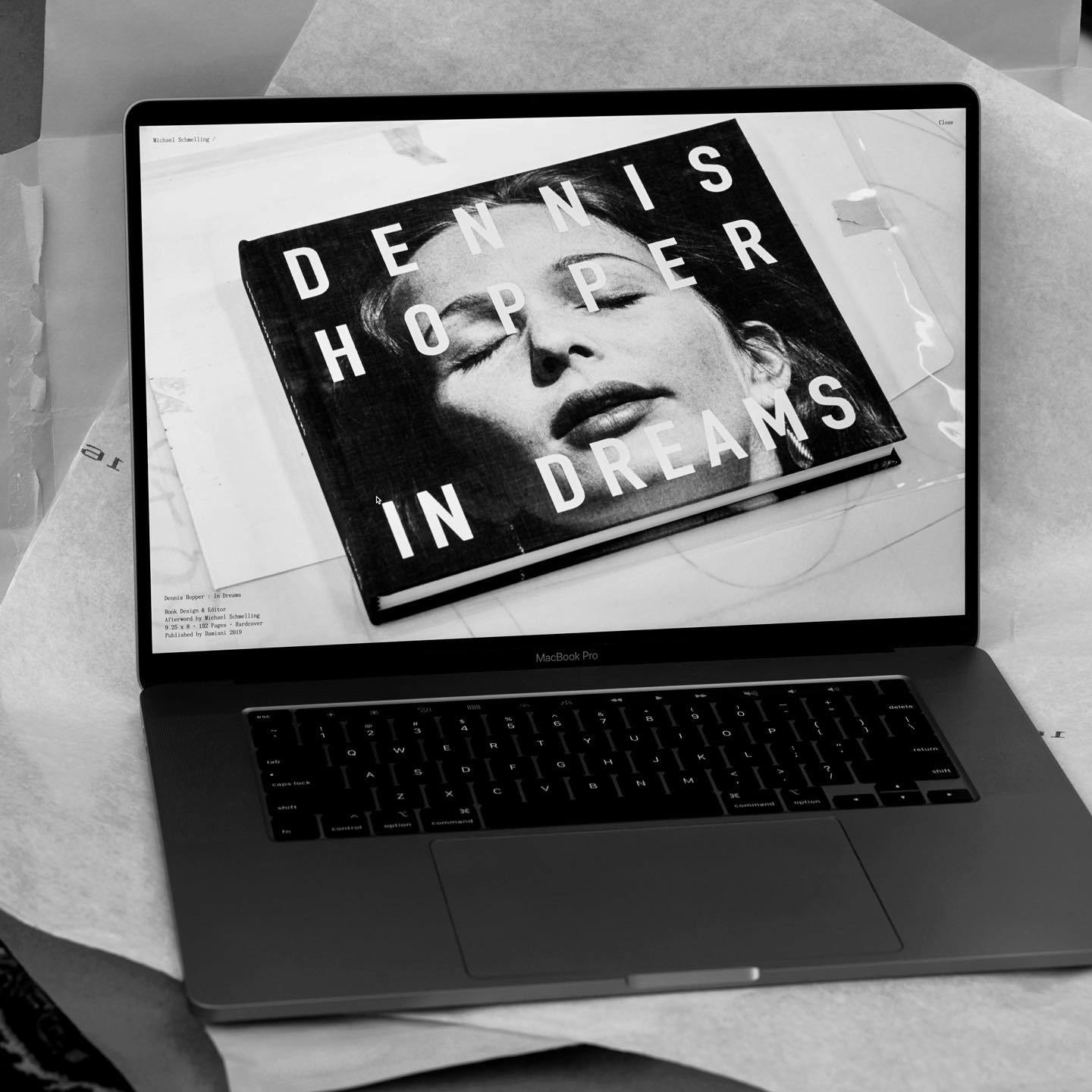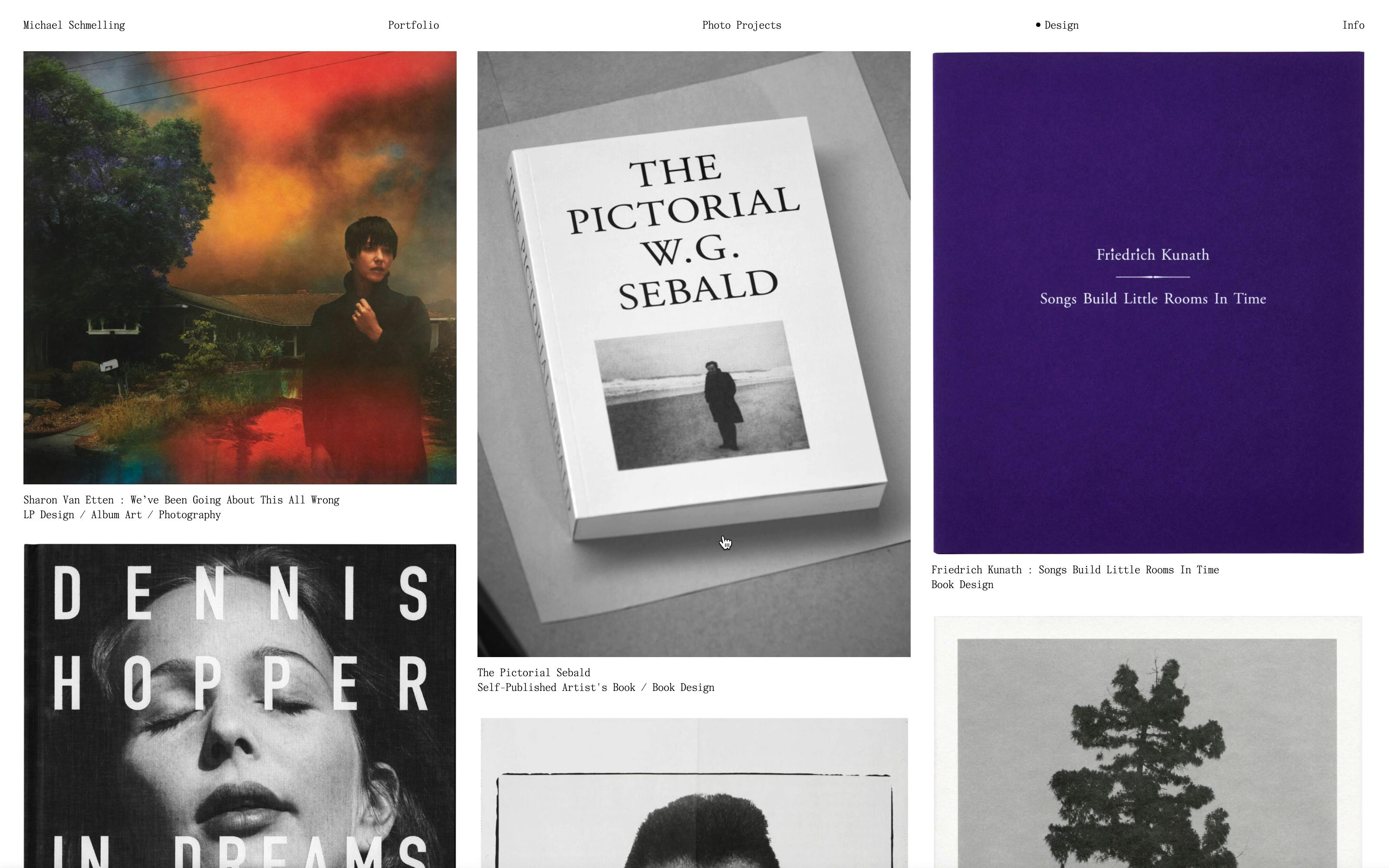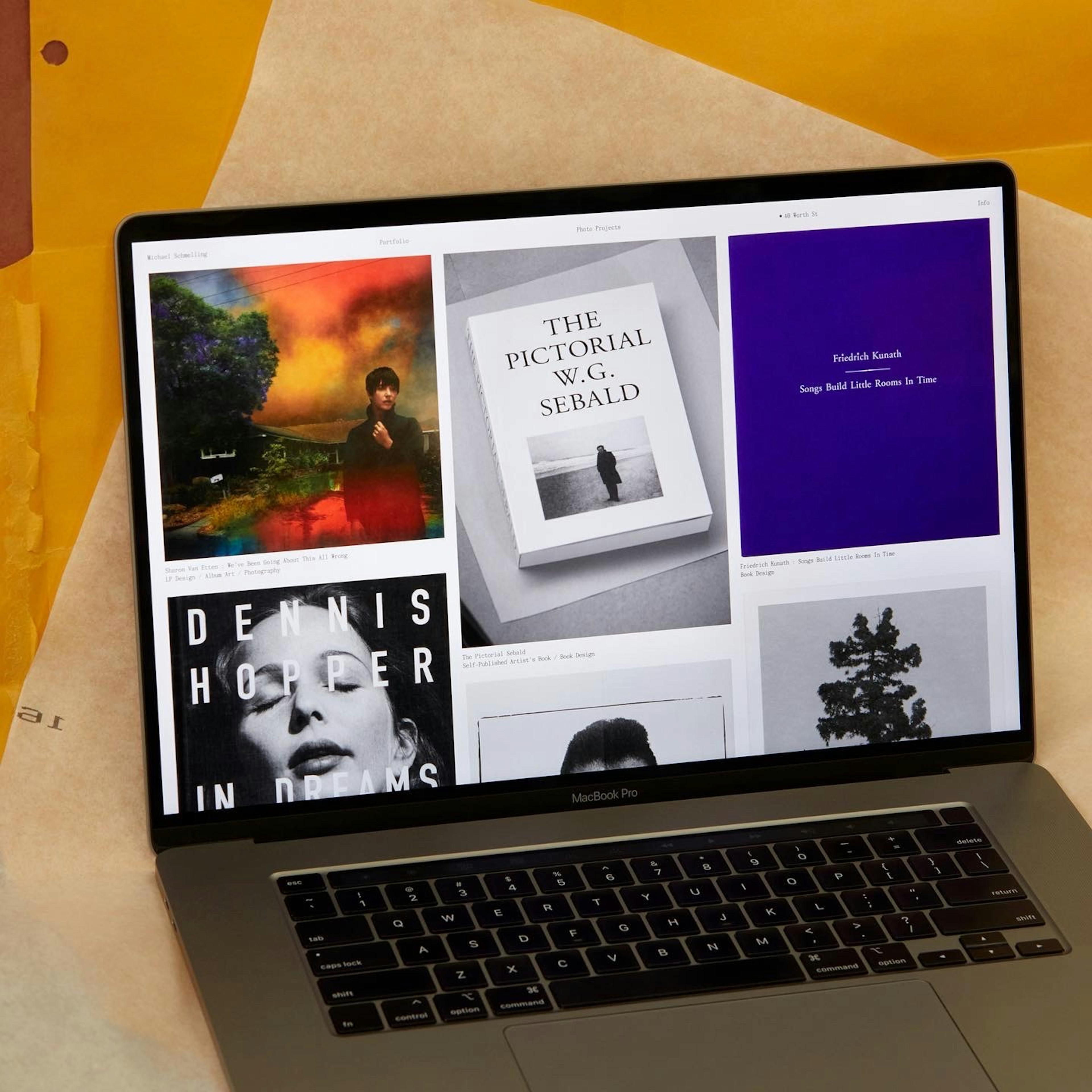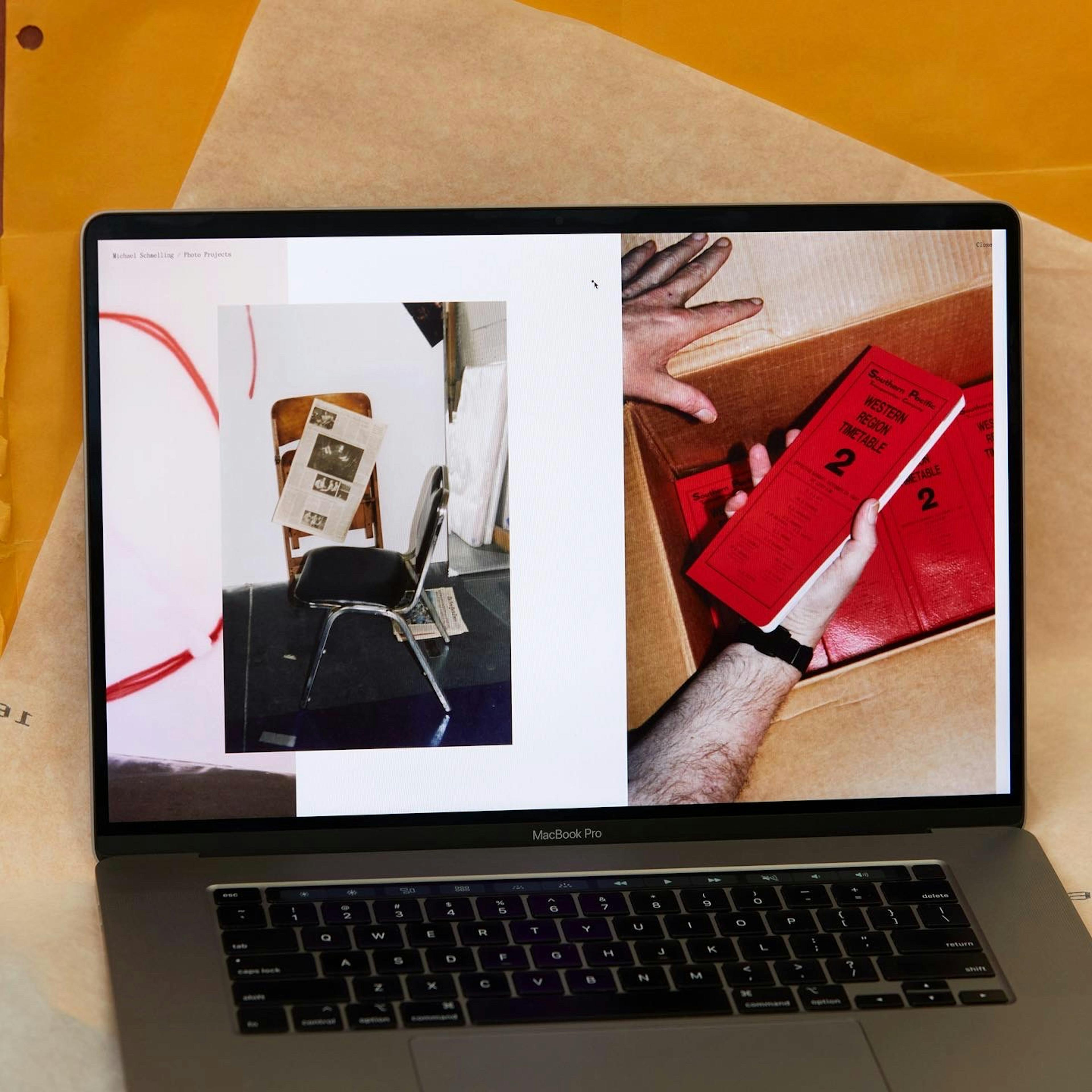 While reviewing Michael’s work, we were drawn to the slightly off, imperfect, messy, and charming way he documents his design work. We asked him to take this same approach to documenting the new website, creating photographs of computers showing books to present on the site — light-hearted, self-referential moment that further highlights Michael’s unique view of the world.