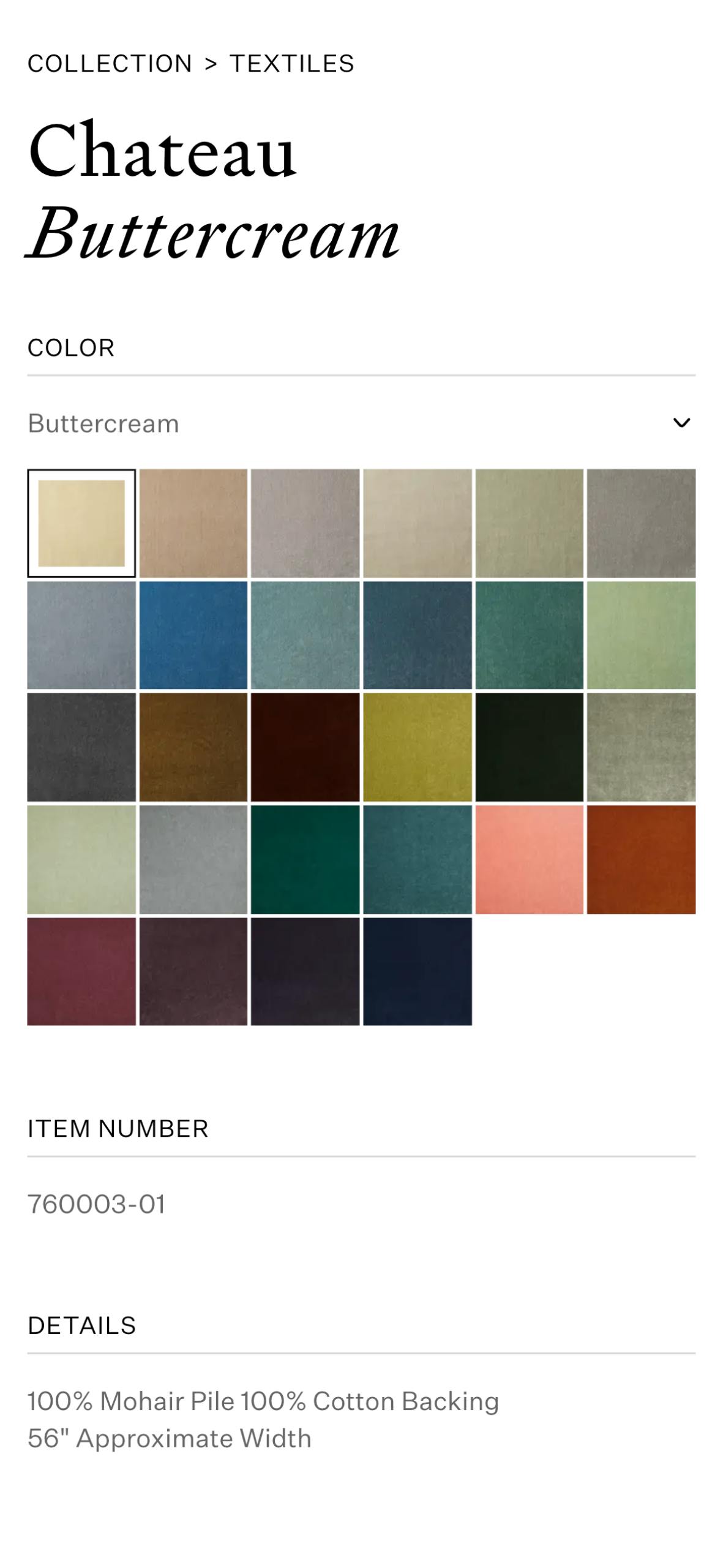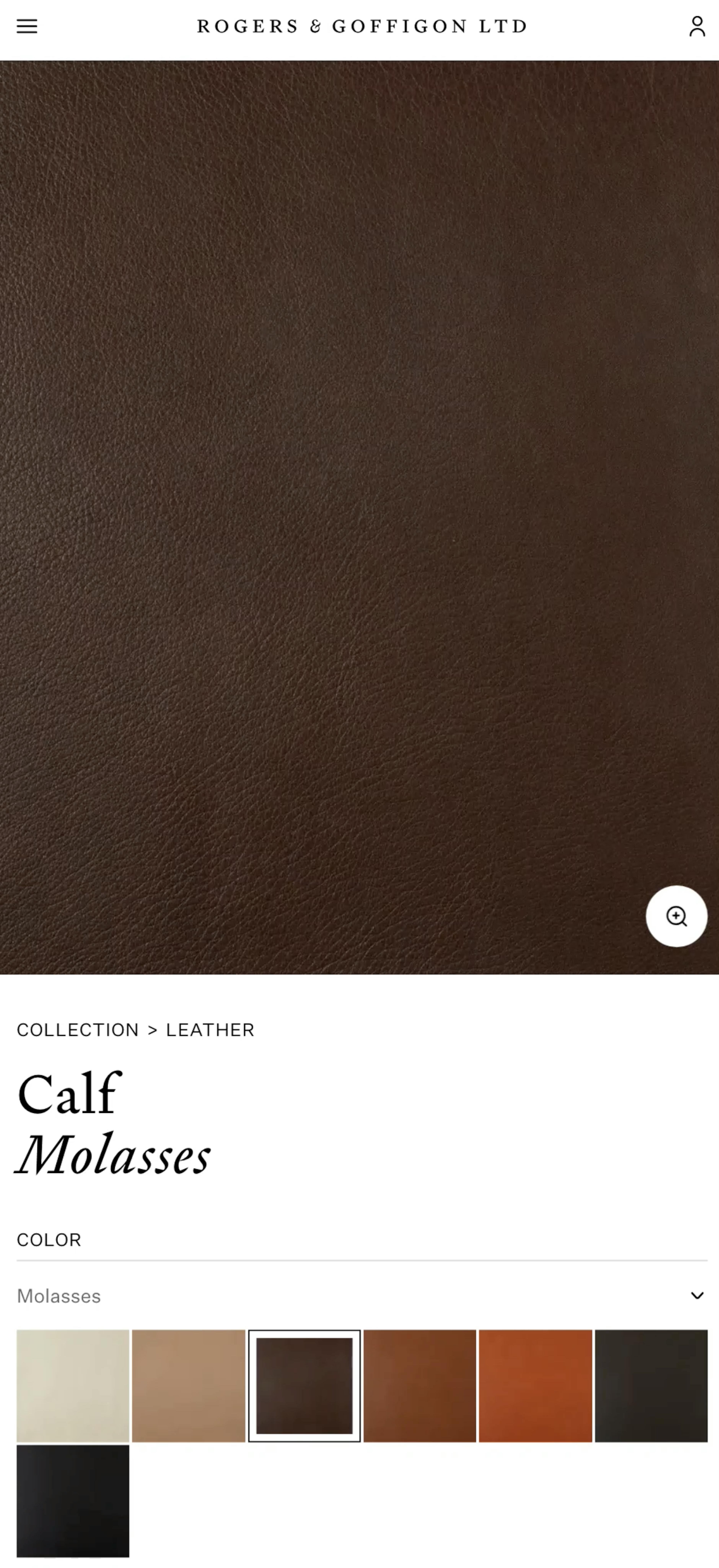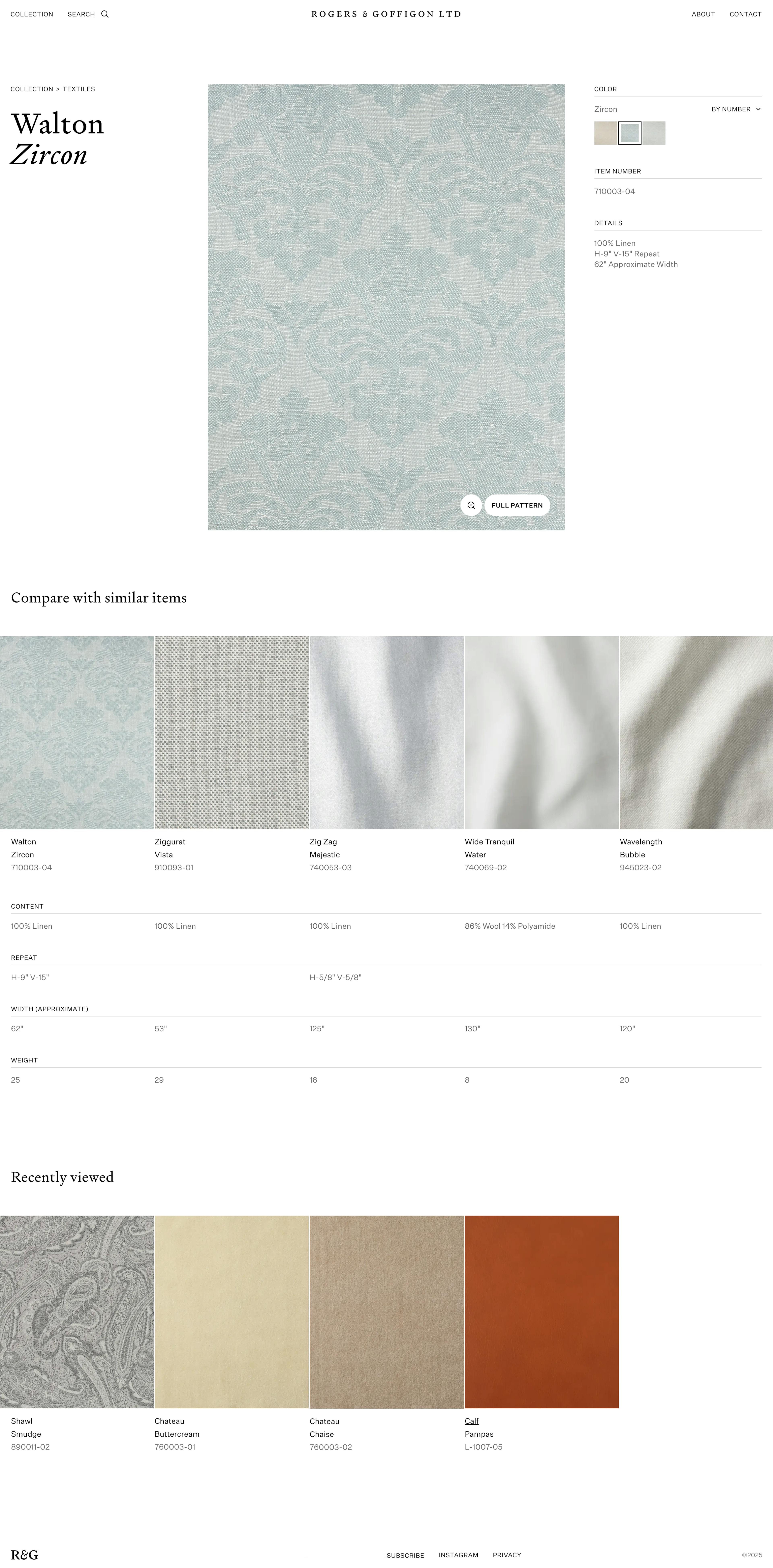 The layout of the product detail page was inspired by the physical sample cards Rogers & Goffigon sends to clients, where the textile itself takes center stage and supporting information is presented alongside it. The former site made comparison difficult, forcing users to navigate back and forth or open multiple browser tabs. We addressed this by introducing a smart comparison table that surfaces related textiles while also keeping recently viewed items accessible at the bottom of the page.