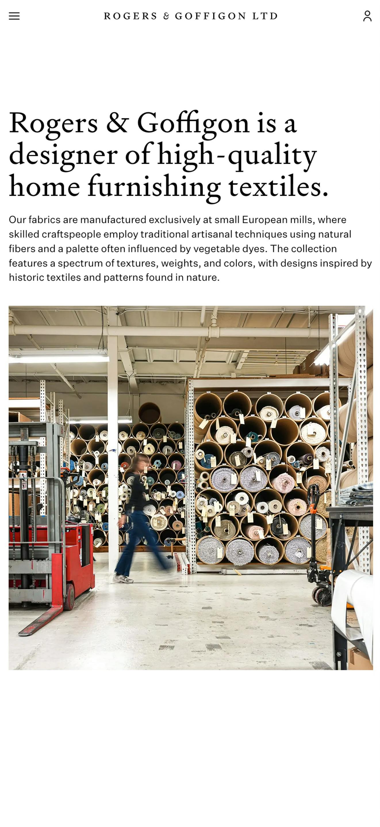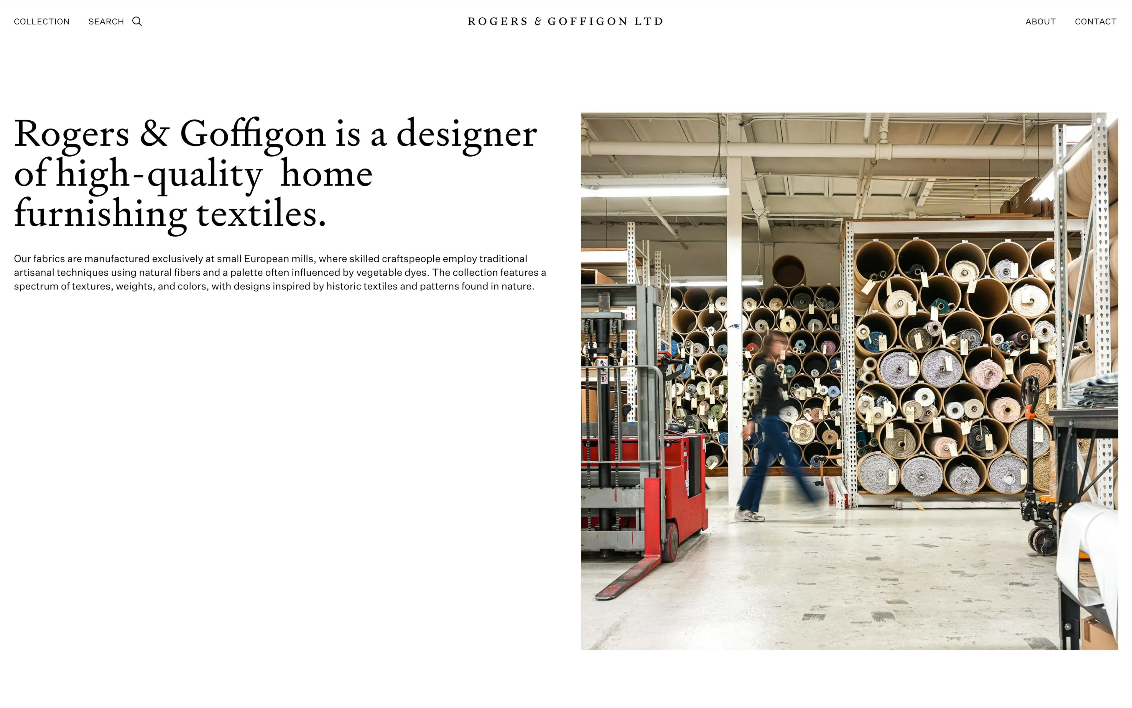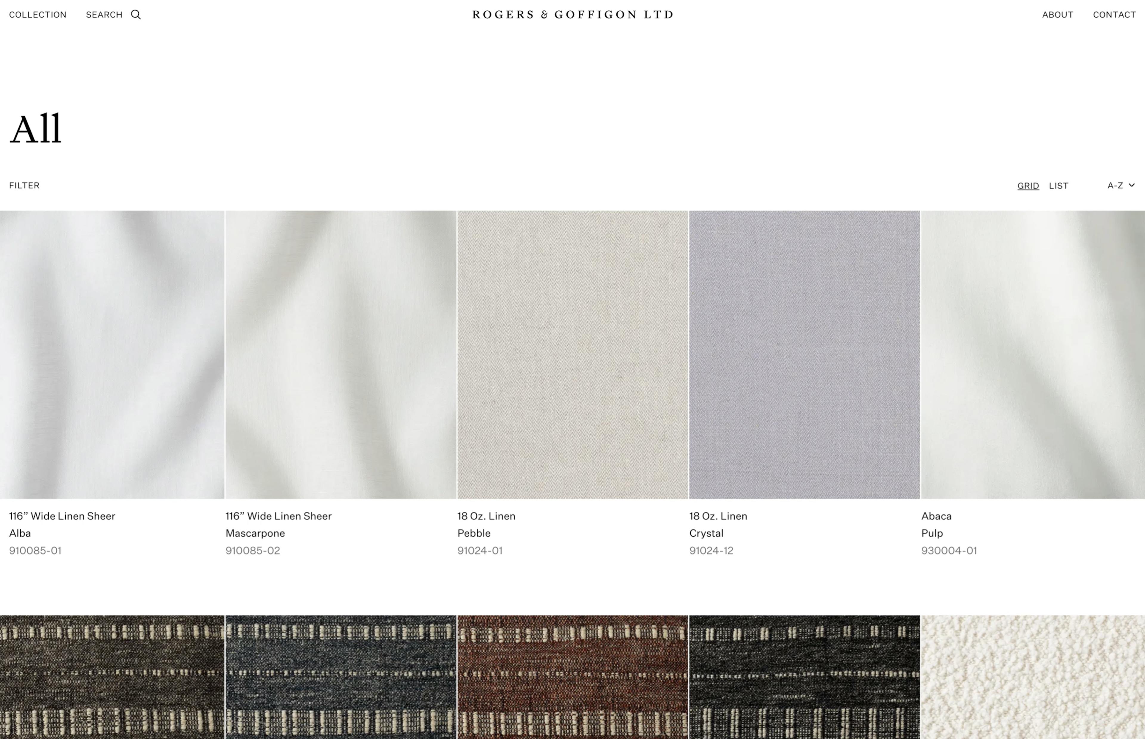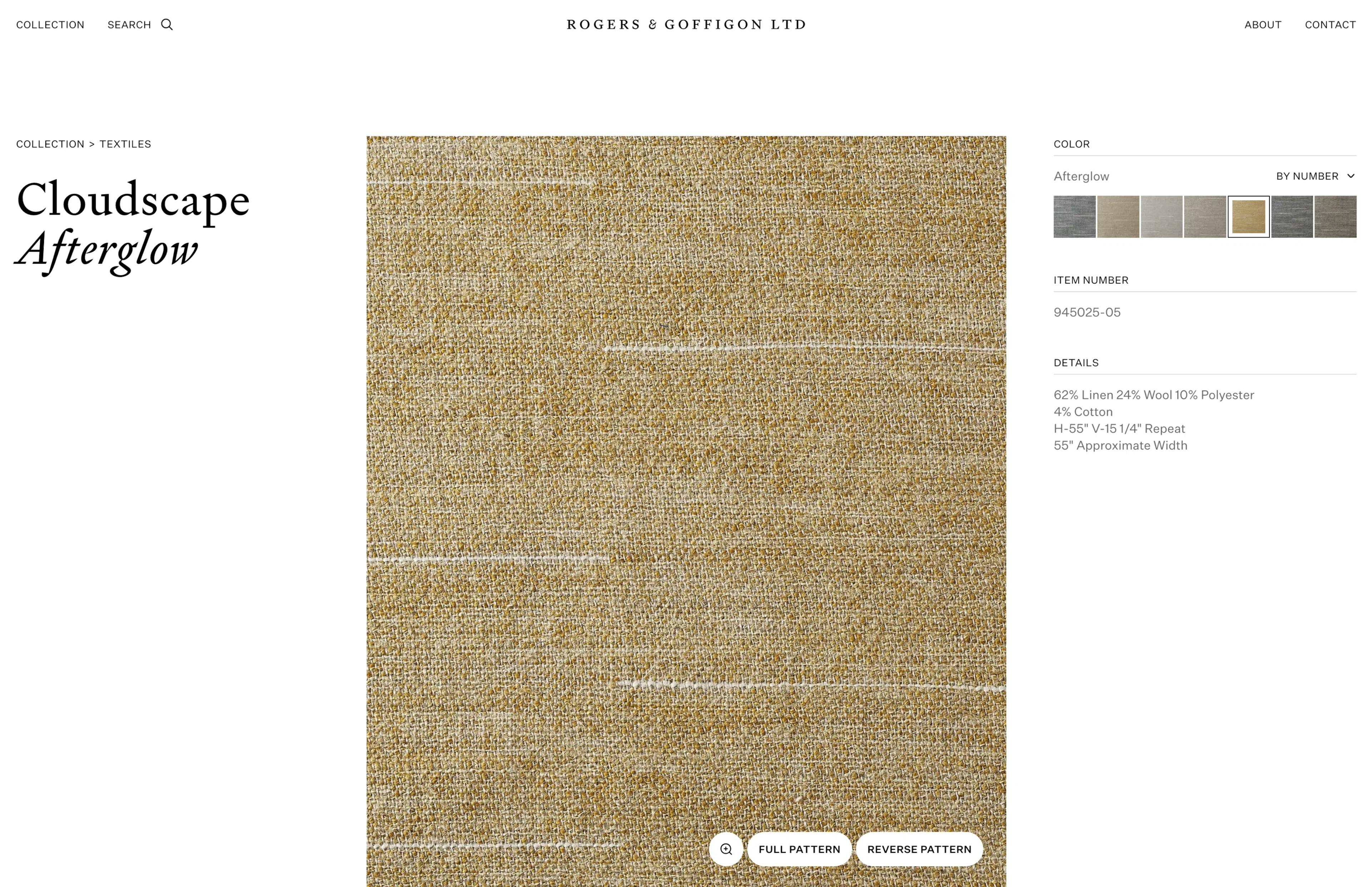 We collaborated with Abbott Miller and his team at Pentagram to modernize the website for Rogers & Goffigon, a design company renowned for its high-quality home-furnishing textiles. The previous site offered a limited mobile experience, and as a primarily B2B platform, it presented clear opportunities to improve how designers browse and compare the collection.